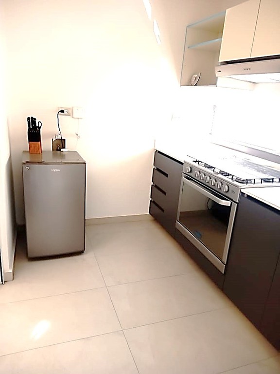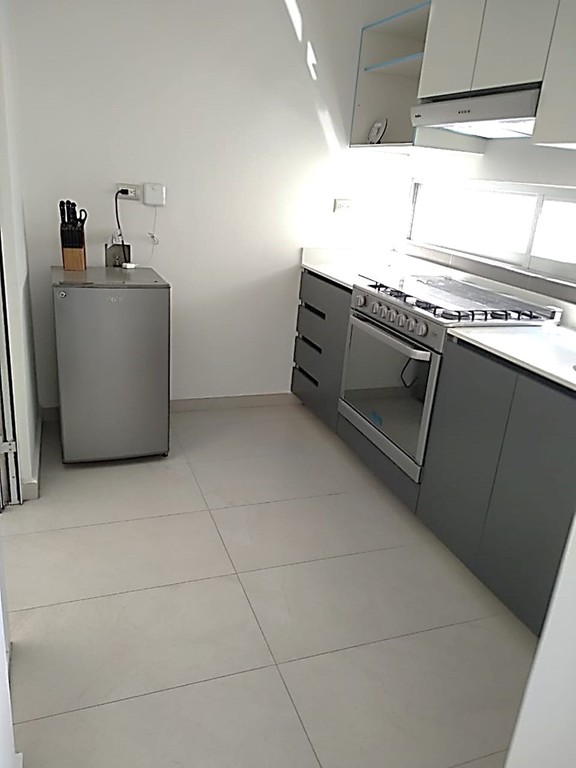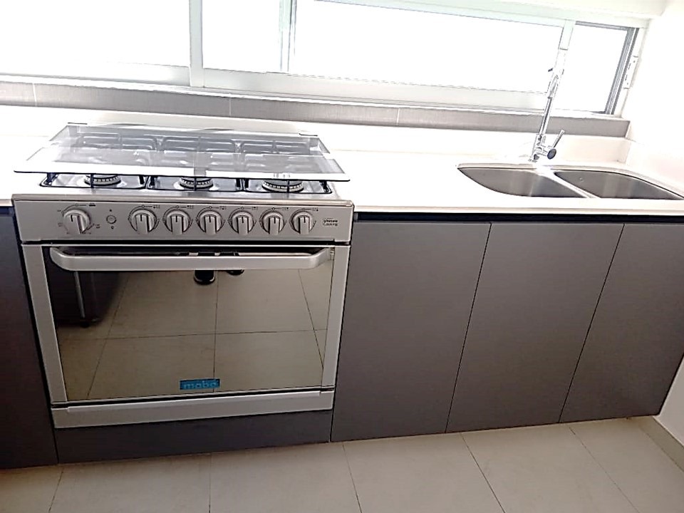 Cocina Integral equipada con estufa, campana, cubierta de cuarzo blanco