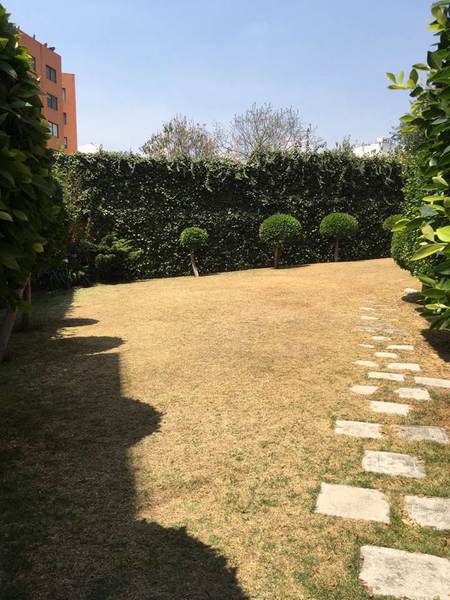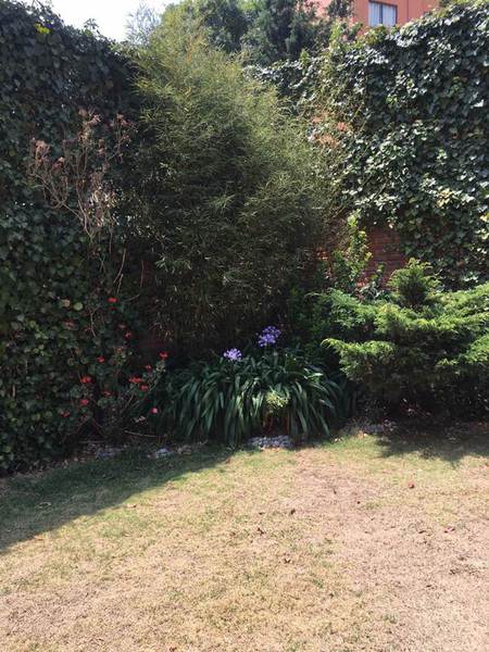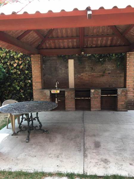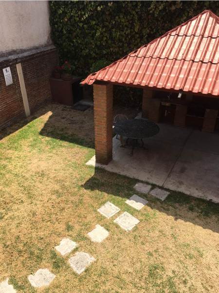 jardín en área común con palapa, asador, columpios y baño de visitas